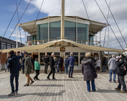 Visitors exploring the Verandah Deck, captivated by the fascinating history of The Royal Yacht Britannia on the complimentary audio tour.