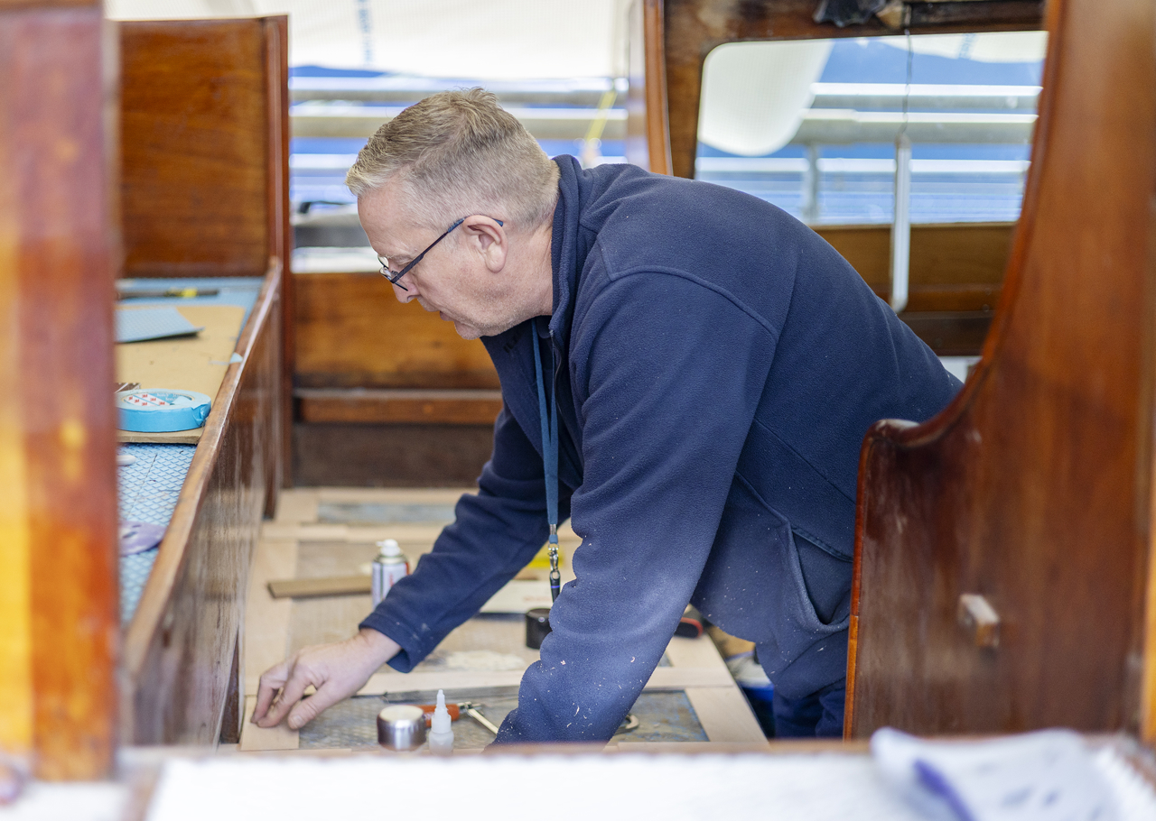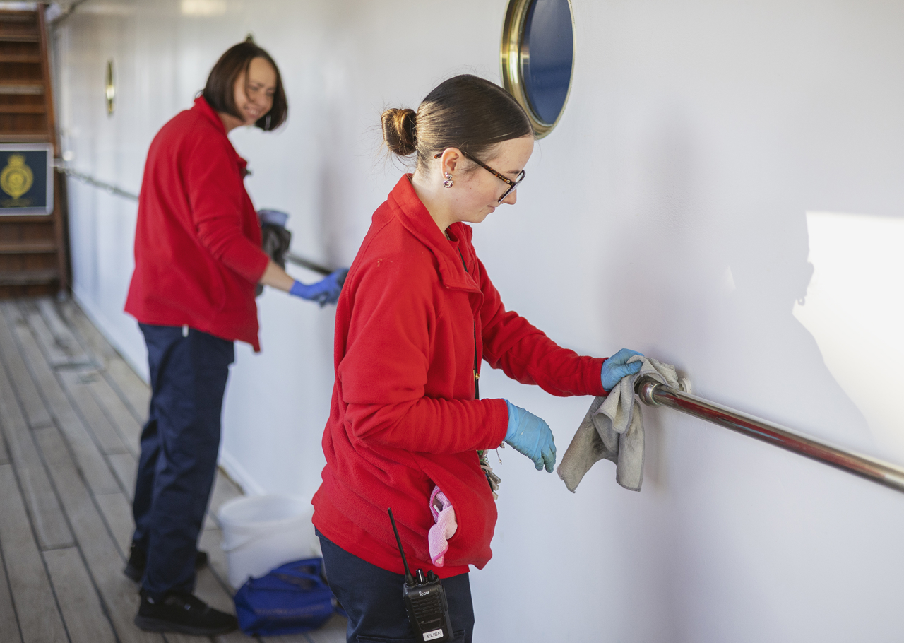 Lynne, Housekeeper, polishing a silver lamp in the Officers' Wardroom where Britannia’s nineteen Officers gathered daily to share meals and relax after long periods on duty.