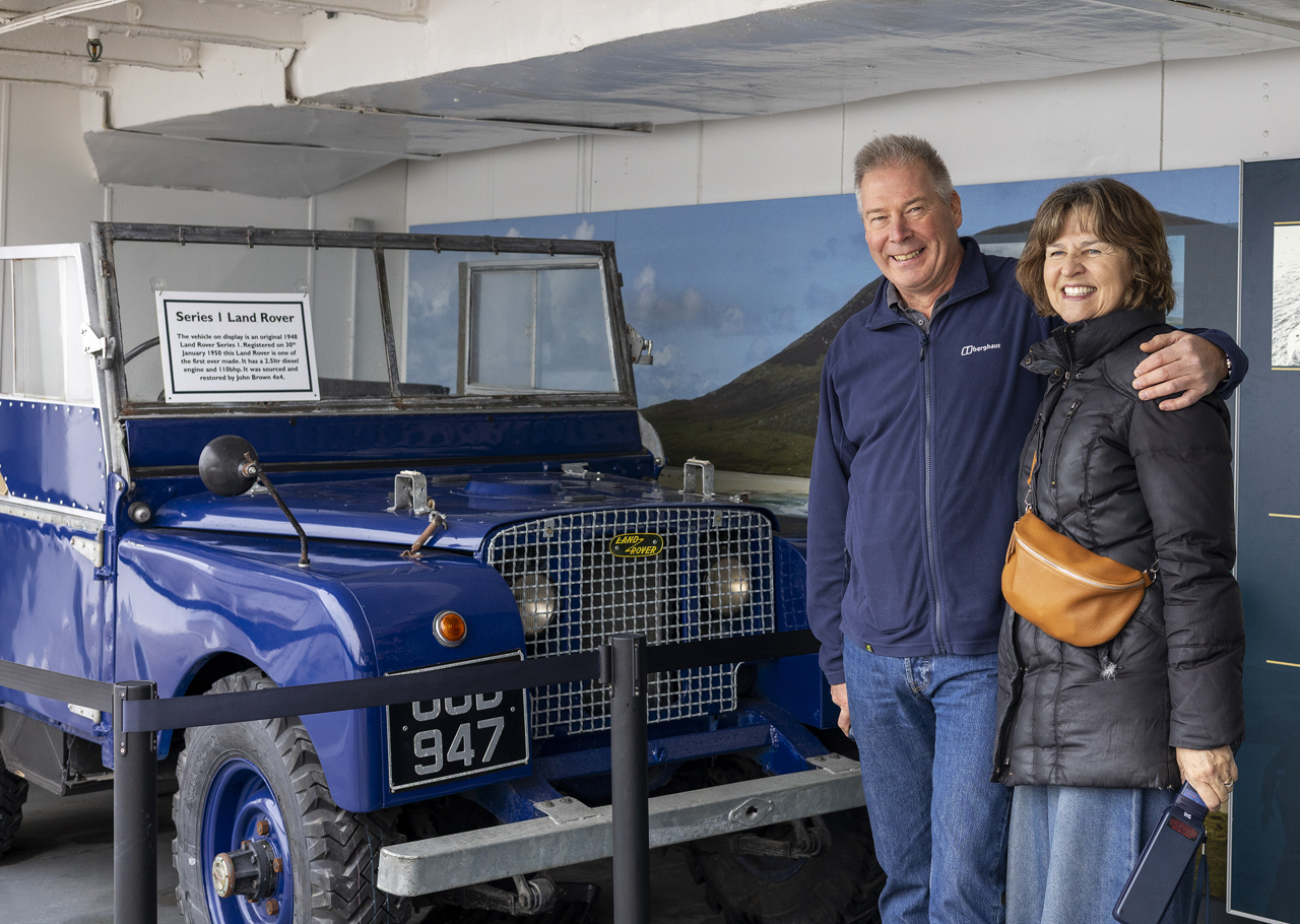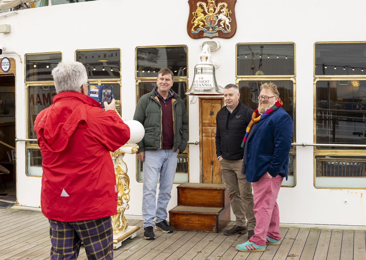 Martin, Visitor Assistant, helping a group of friends capture their day aboard The Royal Yacht Britannia with a photo by the ship's Bell.