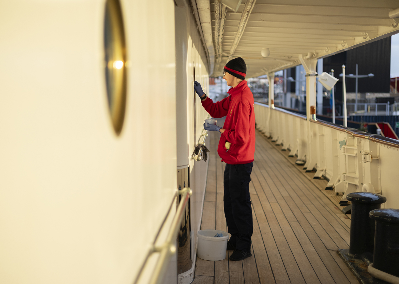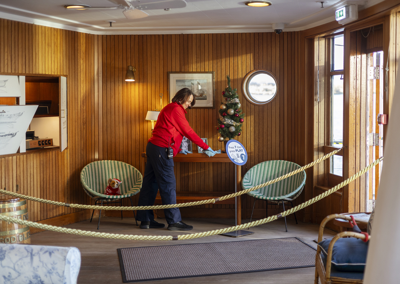 Housekeeper, Renata, ensuring the Sun Lounge is maintained to the same Royal standards as when the ship was in service.