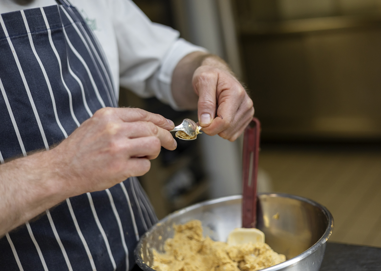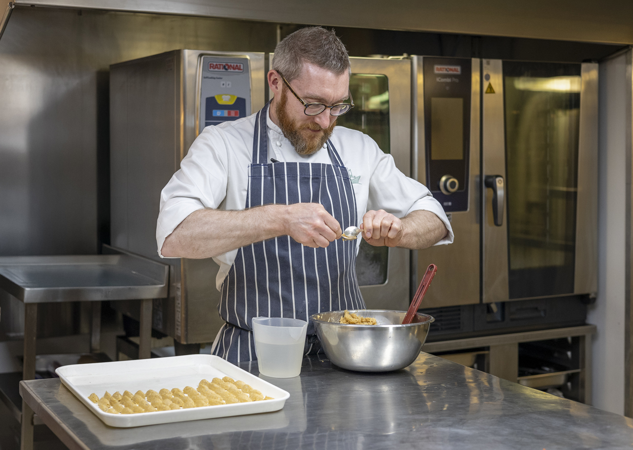 Head Chef, Richard, preparing mackerel quenelles as part of a starter to be served at an evening event.
